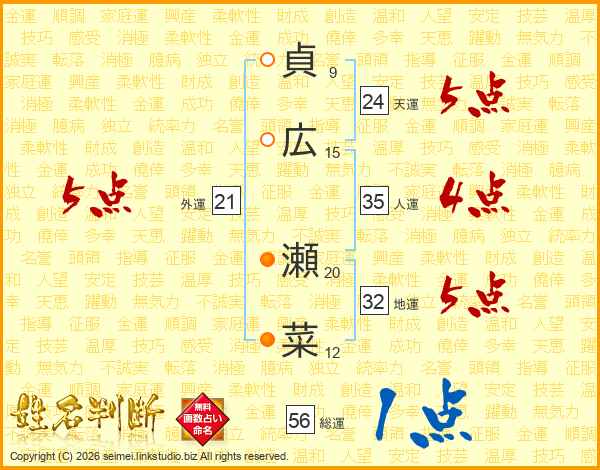 貞広瀬菜さんの総運は56画の1点!