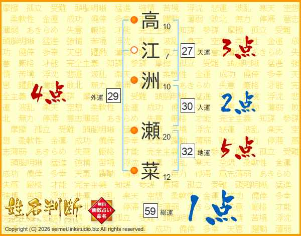 高(10画)江(7画)洲(10画) 瀬(20画)菜(12画)