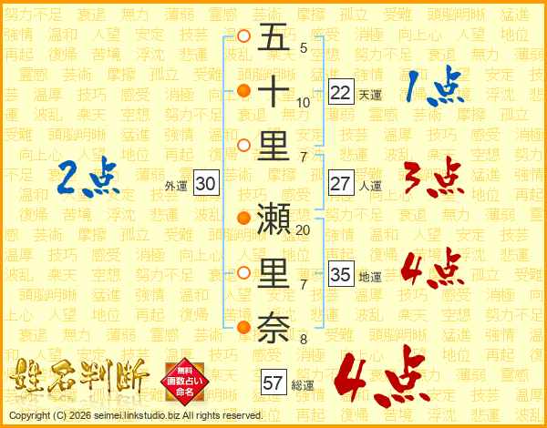 五(5画)十(10画)里(7画) 瀬(20画)里(7画)奈(8画)