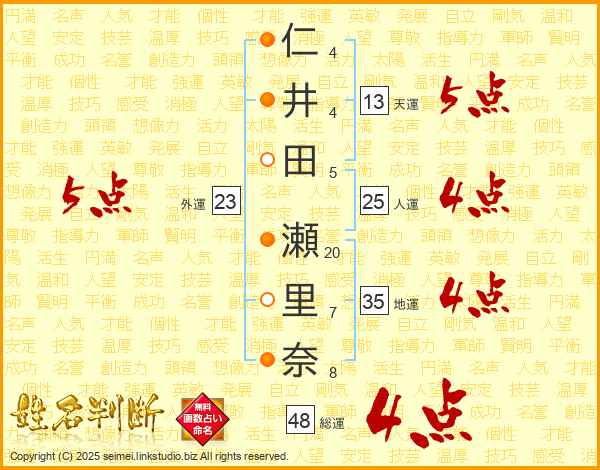 仁(4画)井(4画)田(5画) 瀬(20画)里(7画)奈(8画)