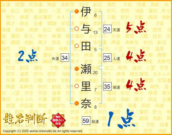伊(6画)与(13画)田(5画) 瀬(20画)里(7画)奈(8画)