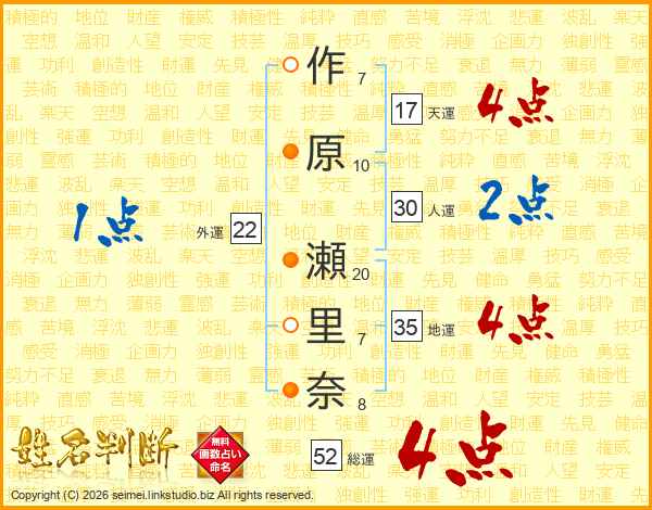 作(7画)原(10画) 瀬(20画)里(7画)奈(8画)
