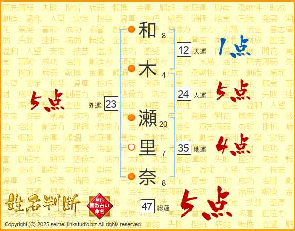 和(8画)木(4画) 瀬(20画)里(7画)奈(8画)