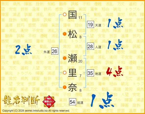 国(11画)松(8画) 瀬(20画)里(7画)奈(8画)