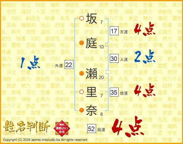 坂庭瀬里奈さんの総運は52画の4点!