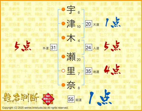 宇(6画)津(10画)木(4画) 瀬(20画)里(7画)奈(8画)