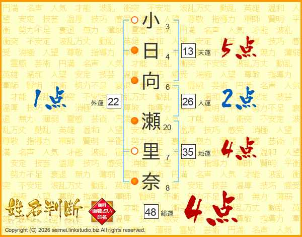 小(3画)日(4画)向(6画) 瀬(20画)里(7画)奈(8画)