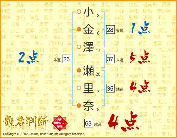 小(3画)金(8画)澤(17画) 瀬(20画)里(7画)奈(8画)