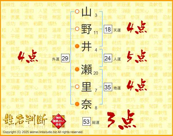 山(3画)野(11画)井(4画) 瀬(20画)里(7画)奈(8画)