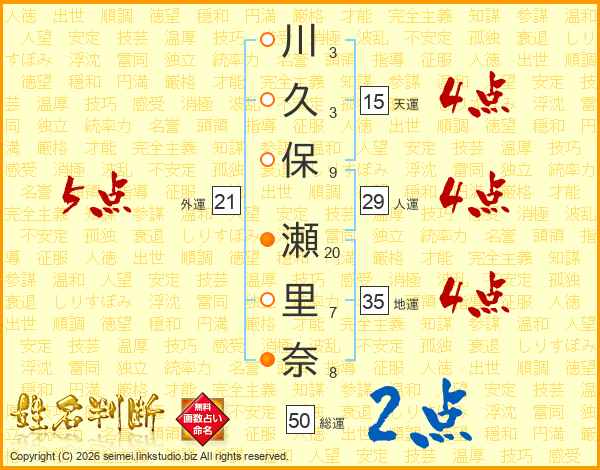 川(3画)久(3画)保(9画) 瀬(20画)里(7画)奈(8画)