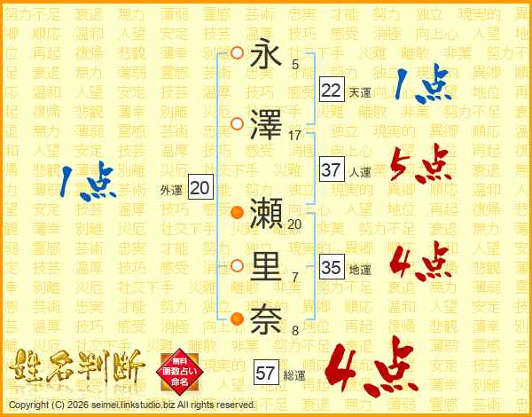永(5画)澤(17画) 瀬(20画)里(7画)奈(8画)