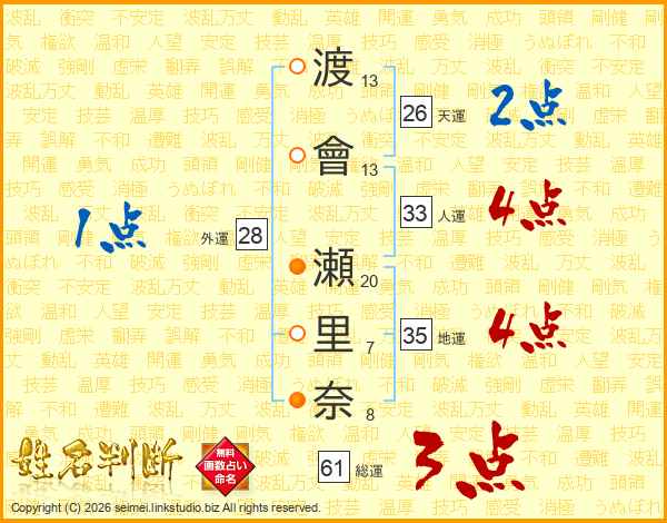 渡(13画)會(13画) 瀬(20画)里(7画)奈(8画)
