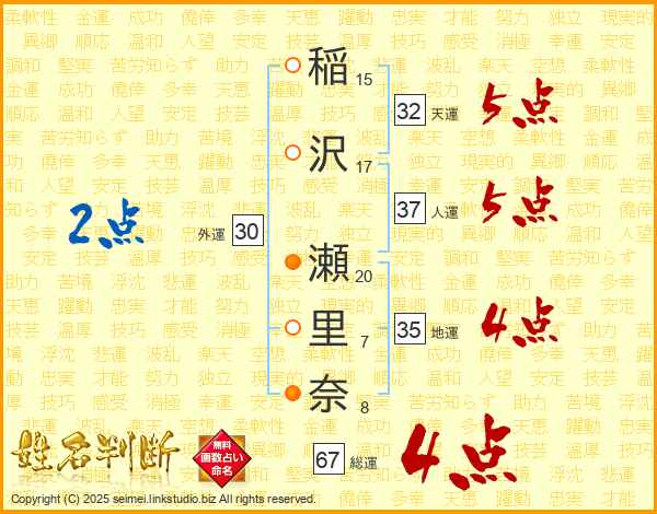 稲(15画)沢(17画) 瀬(20画)里(7画)奈(8画)