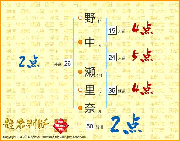 野(11画)中(4画) 瀬(20画)里(7画)奈(8画)