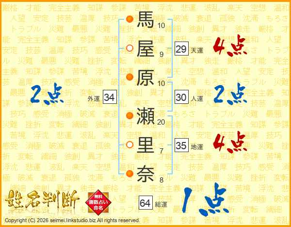 馬(10画)屋(9画)原(10画) 瀬(20画)里(7画)奈(8画)