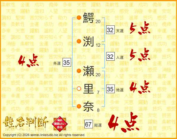 鰐渕瀬里奈さんの総運は67画の4点!