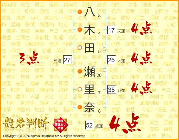 八(8画)木(4画)田(5画) 瀬(20画)里(7画)奈(8画)