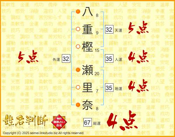 八(8画)重(9画)樫(15画) 瀬(20画)里(7画)奈(8画)