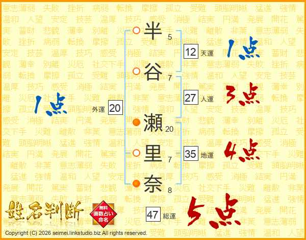 半(5画)谷(7画) 瀬(20画)里(7画)奈(8画)