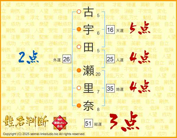 古宇田瀬里奈さんの総運は51画の3点