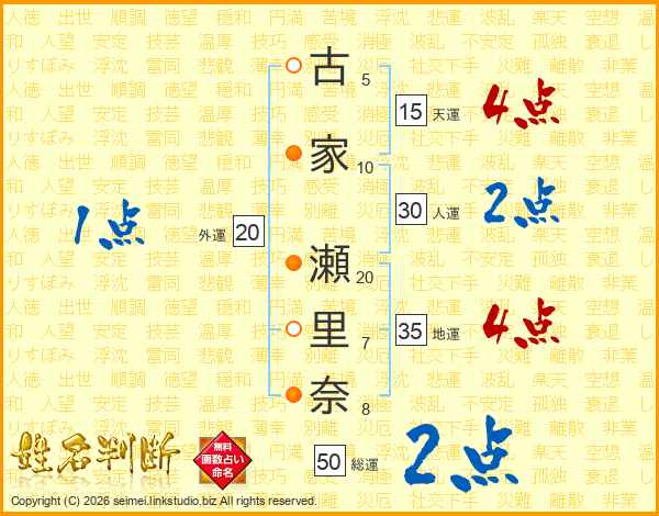 古(5画)家(10画) 瀬(20画)里(7画)奈(8画)