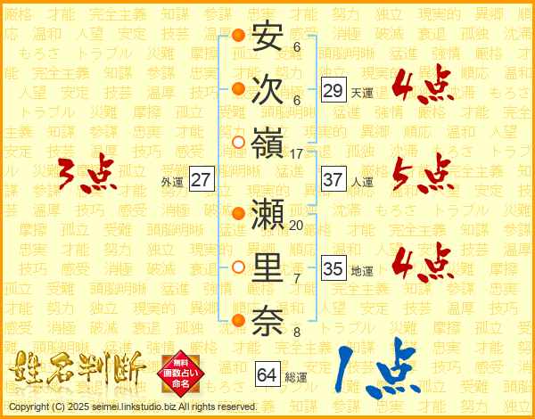 安(6画)次(6画)嶺(17画) 瀬(20画)里(7画)奈(8画)