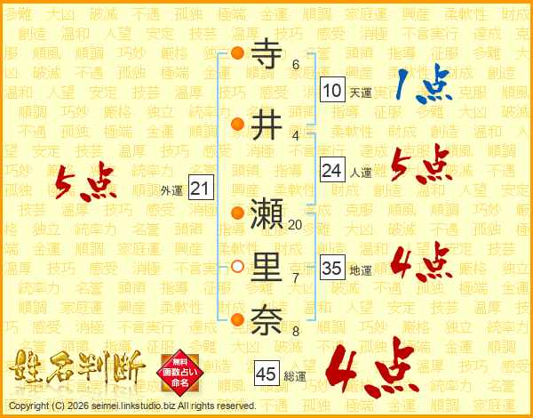 寺(6画)井(4画) 瀬(20画)里(7画)奈(8画)