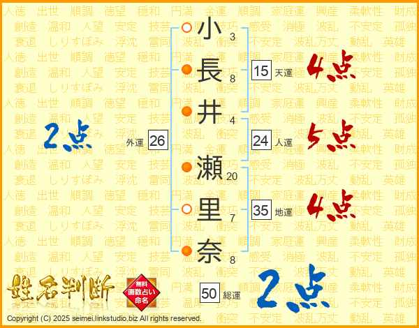 小(3画)長(8画)井(4画) 瀬(20画)里(7画)奈(8画)