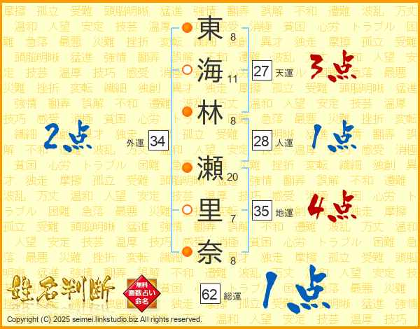 東(8画)海(11画)林(8画) 瀬(20画)里(7画)奈(8画)