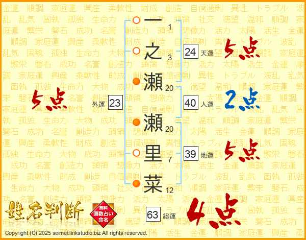 一之瀬瀬里菜さんの総運は63画の4点!