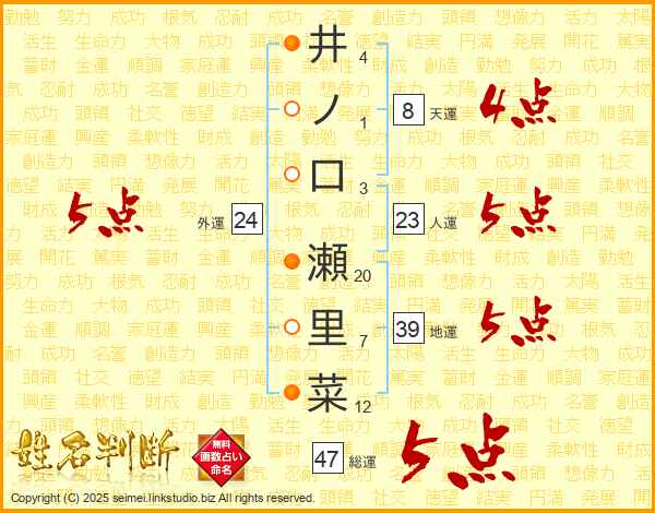 井(4画)ノ(1画)口(3画) 瀬(20画)里(7画)菜(12画)