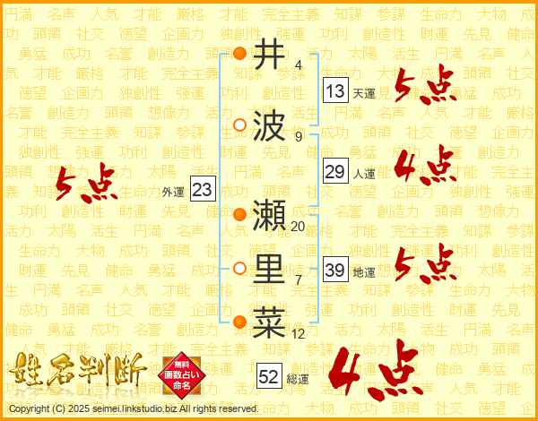 井(4画)波(9画) 瀬(20画)里(7画)菜(12画)