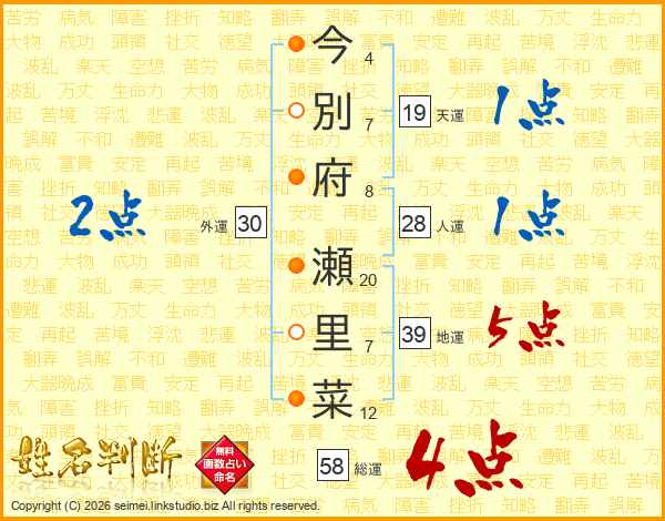 今(4画)別(7画)府(8画) 瀬(20画)里(7画)菜(12画)