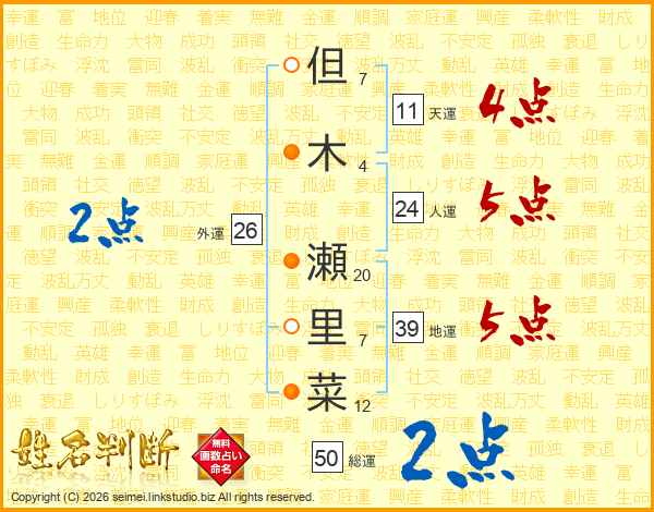 但木瀬里菜さんの地運は39画の5点!