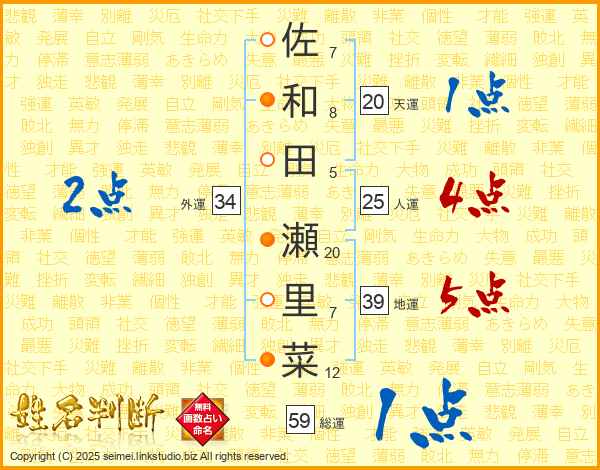 佐(7画)和(8画)田(5画) 瀬(20画)里(7画)菜(12画)