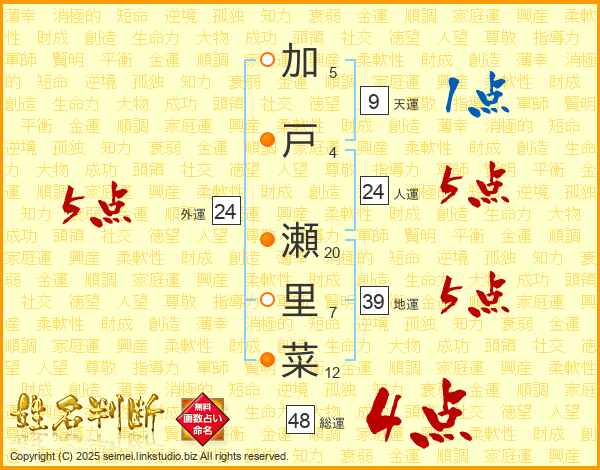 加戸瀬里菜さんの人運は24画の5点!
