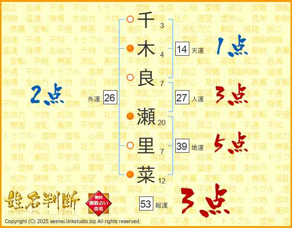 千(3画)木(4画)良(7画) 瀬(20画)里(7画)菜(12画)