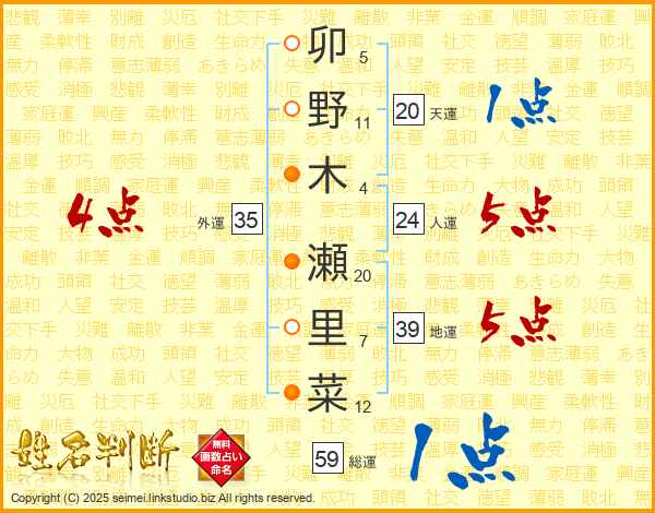卯(5画)野(11画)木(4画) 瀬(20画)里(7画)菜(12画)