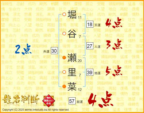堀(11画)谷(7画) 瀬(20画)里(7画)菜(12画)
