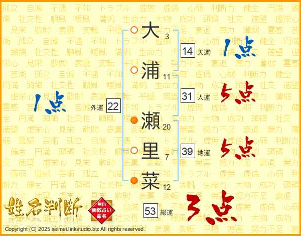 大(3画)浦(11画) 瀬(20画)里(7画)菜(12画)