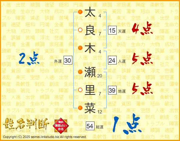 太(4画)良(7画)木(4画) 瀬(20画)里(7画)菜(12画)