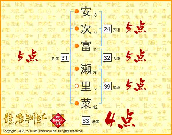 安(6画)次(6画)富(12画) 瀬(20画)里(7画)菜(12画)