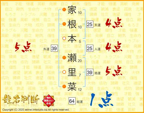 家(10画)根(10画)本(5画) 瀬(20画)里(7画)菜(12画)