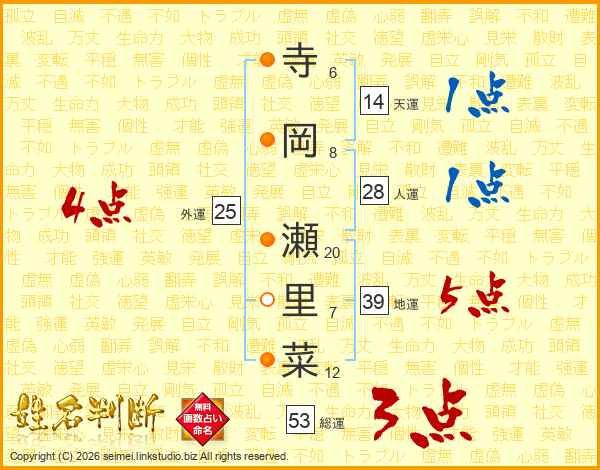 寺岡瀬里菜さんの地運は39画の5点!