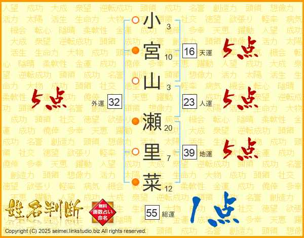小(3画)宮(10画)山(3画) 瀬(20画)里(7画)菜(12画)