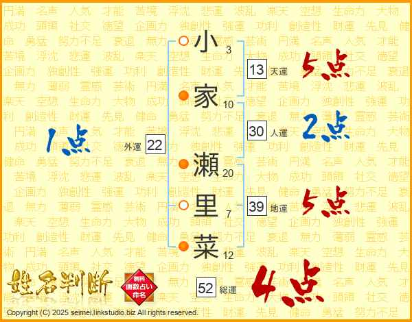 小家瀬里菜さんの総運は52画の4点!