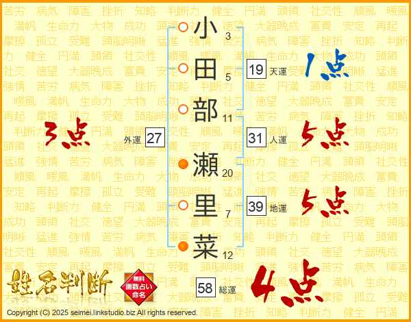 小(3画)田(5画)部(11画) 瀬(20画)里(7画)菜(12画)