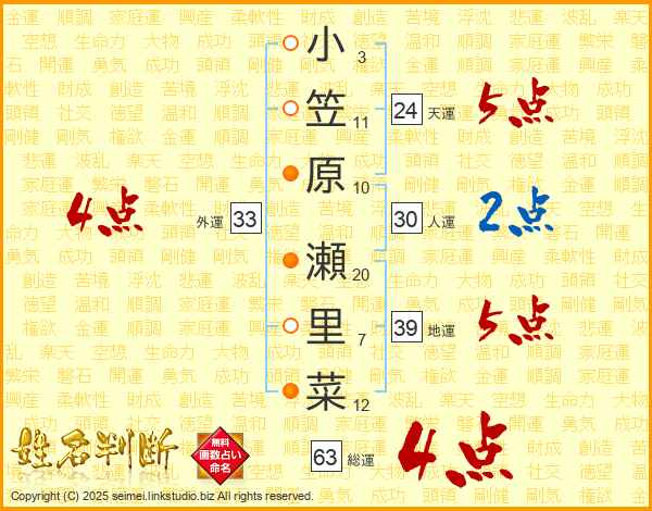 小笠原瀬里菜さんの総運は63画の4点!