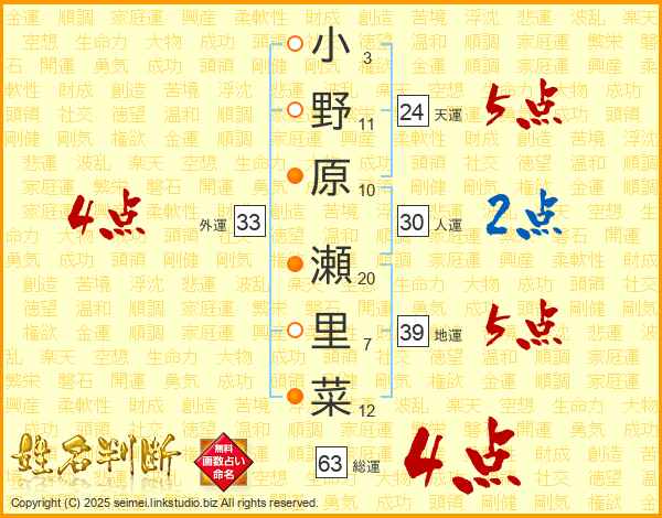 小(3画)野(11画)原(10画) 瀬(20画)里(7画)菜(12画)
