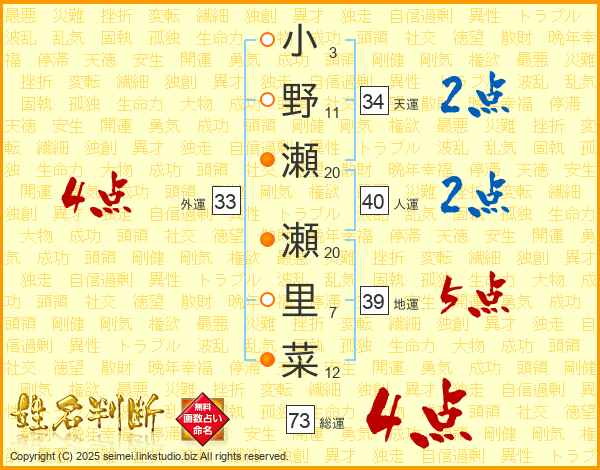 小(3画)野(11画)瀬(20画) 瀬(20画)里(7画)菜(12画)